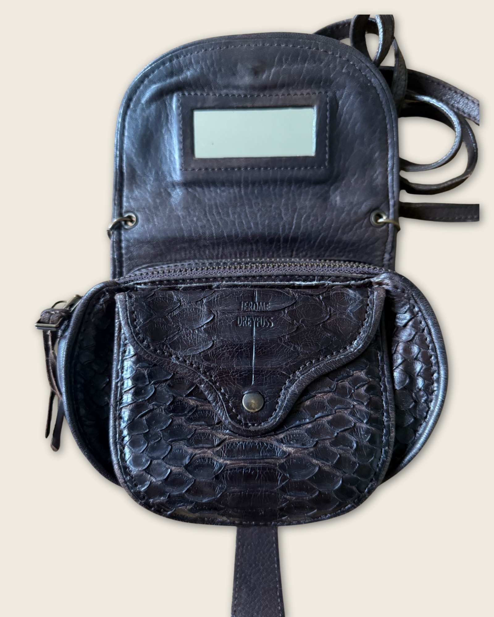 Iconique et recherché, ce sac bandoulière Momo Jérôme Dreyfuss en cuir python marron incarne parfaitement l’esprit bohème chic et le savoir-faire artisanal de la maison parisienne.