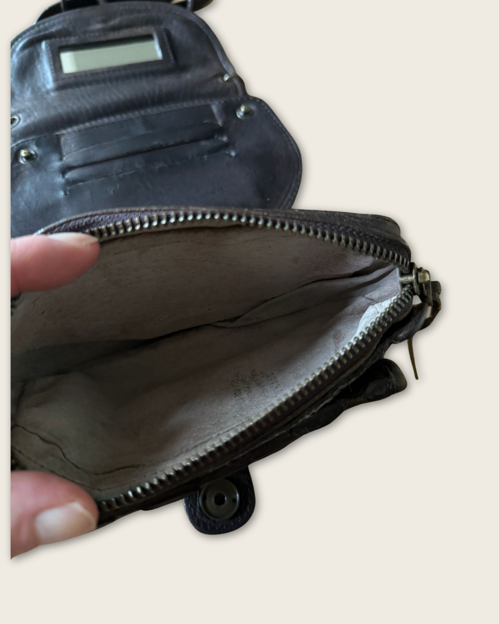 L’extérieur est en très bon état, conservant toute la beauté du cuir. L’intérieur est en bon état : à noter que l’intérieur des poches présente une légère décoloration, non visible au porté et n’altérant en rien l’usage ni l’esthétique globale du sac.